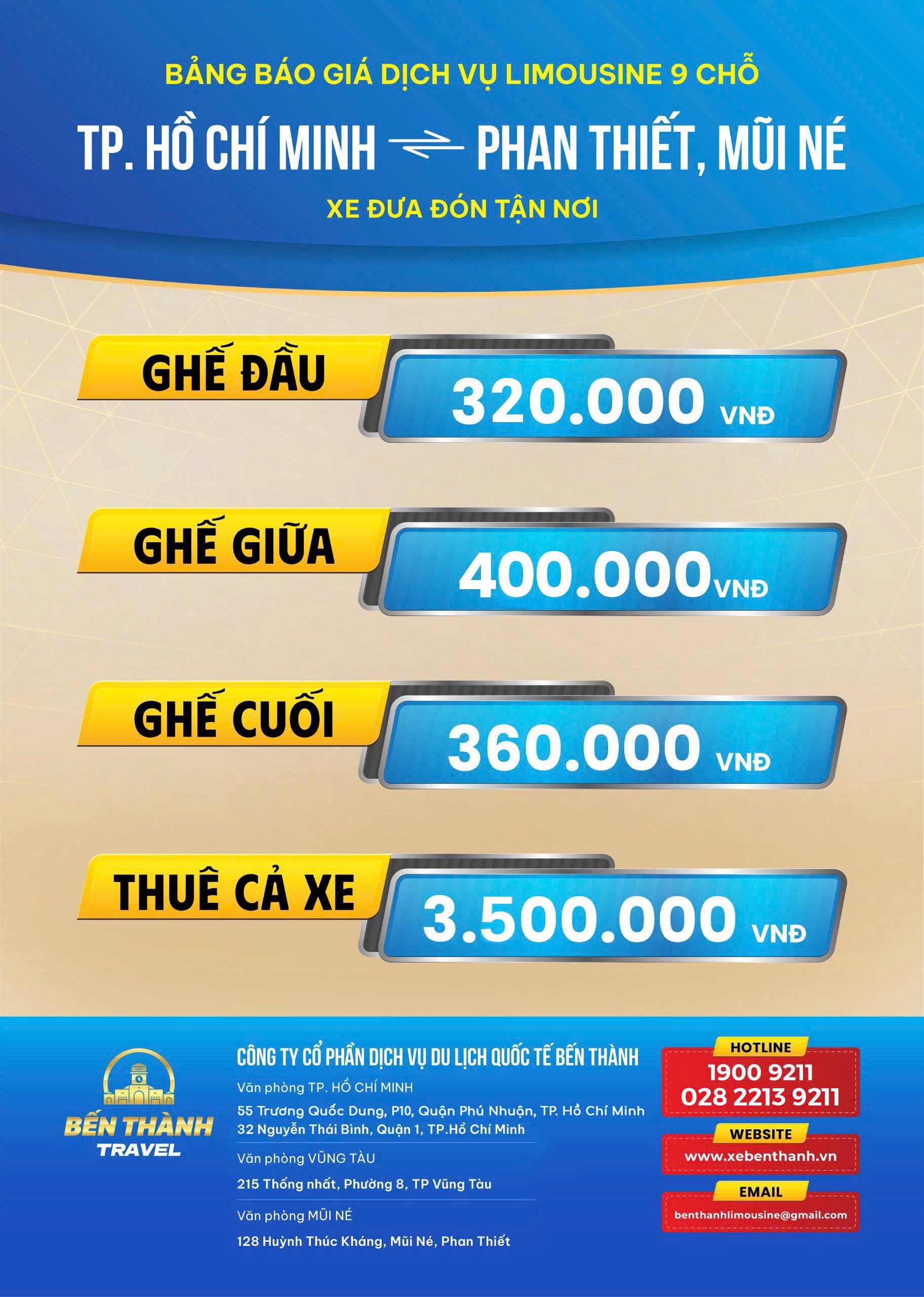 Dưới đây là bảng giá vé xe Limousine 9 chỗ Sài Gòn – Phan Thiết – Mũi Né do Bến Thành Travel cung cấp: