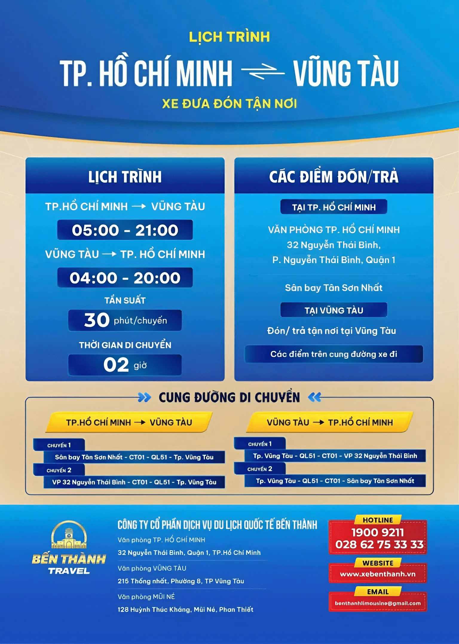 Chuyến 1: SB Tân Sơn Nhất ⇔ CT01 ⇔ QL 51 ⇔ TP Vũng Tàu Chuyến 2: VP 32 Nguyễn Thái Bình, Quận 1, HCM ⇔ CT01 – QL 51 ⇔ Tận Nơi TP Vũng Tàu |